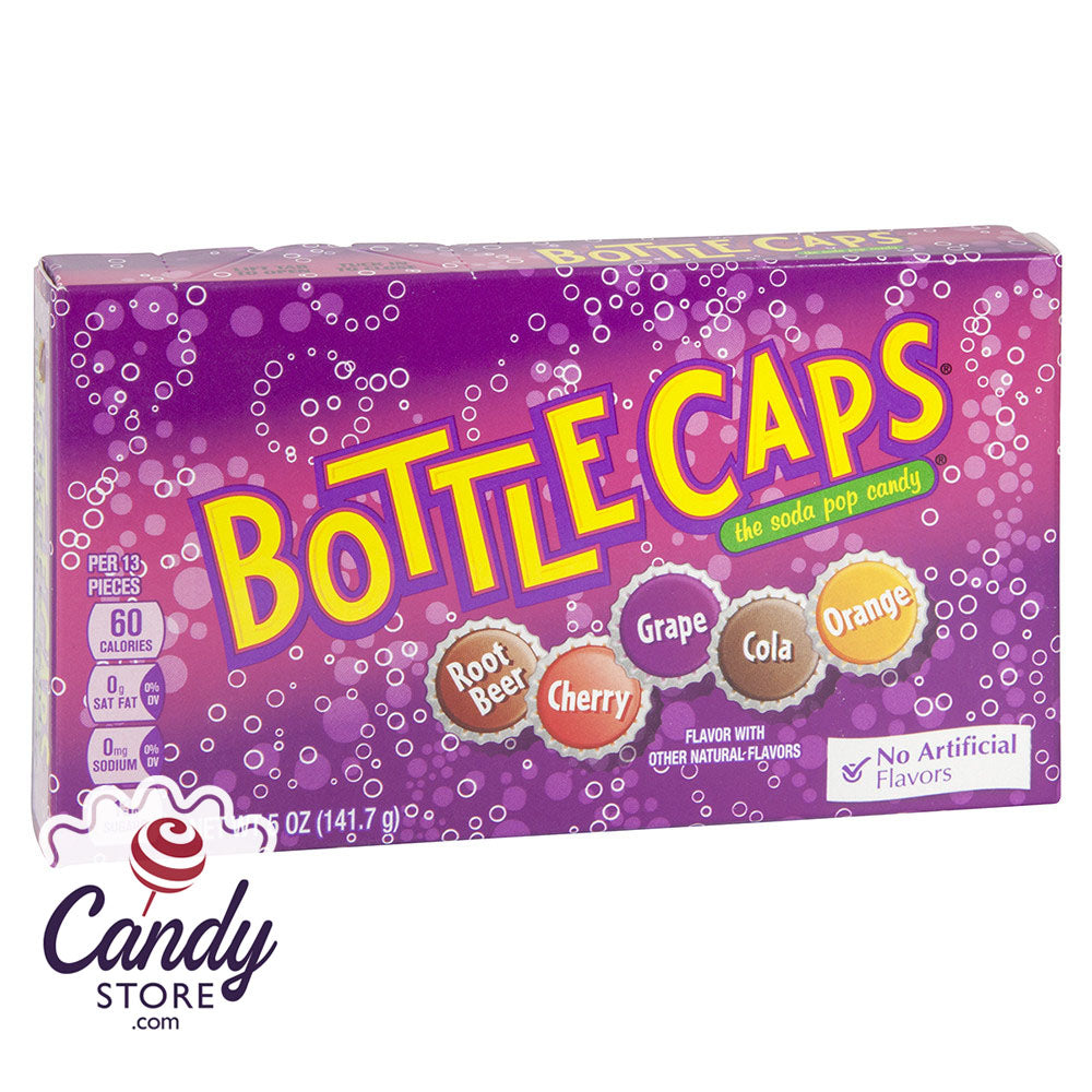 Bottle Caps are round, bite-sized pieces of tart tablet candy that feature fun colors and a unique shape. The top includes bottle cap style markings that are reminiscent of old cola bottles. Our Bottle Cap theater boxes include all the original flavors you love! Sink your teeth into cola, grape, root beer, cherry or orange bottle cap tarts. Bulk Bottle Caps are convenient for parties and events.