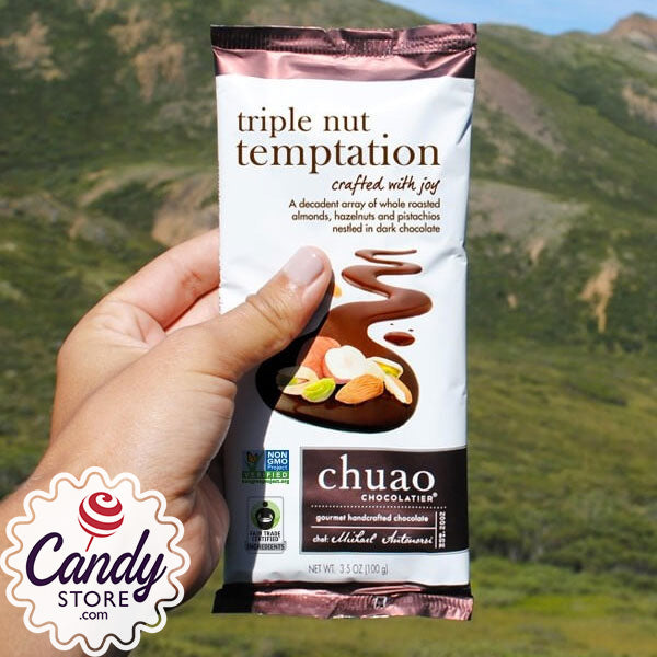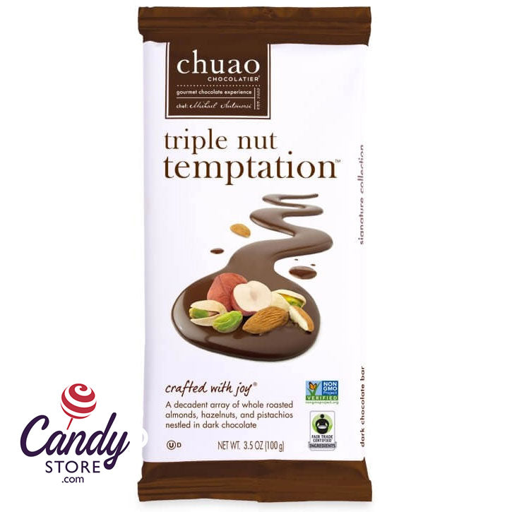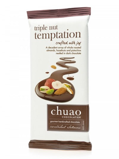 Triple Nut Temptation gourmet handcrafted chocolate bars from Chuao Chocolatier. Using premium ingredients, Chuao has created a wonderful chocolate bar with gourmet dark chocolate, whole roasted almonds, hazelnuts and pistachios.