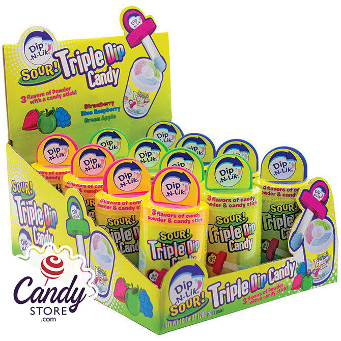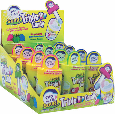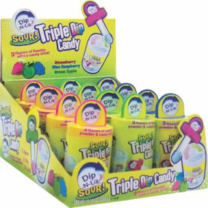 Dip into this sour candy and lick it off. Three flavors are green apple, strawberry and blue raspberry. Sour candy dipping goodness doesn’t get better than this.