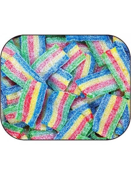 Fascini sour mini belts will entice both the eyes and the taste buds! This fun treat includes a thin bite-sized belt of chewy gummy confection. Kids will love biting, stretching, and bending their belts at snack time. Each is layered in four brilliant colors, including red, yellow, blue, and green. All sides are covered in sour sugar granules to keep your taste buds tingling. Discover the best sweet and sour gummy candy with Fascini belts!