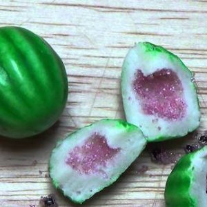 Giant sour watermelon gumballs are the next best thing to the actual fruit! This sweet confection gives you everything you love about melons in a chewy, long lasting treat. The outside has a crisp green candy coating with a raised shape that looks just like a real watermelon rind. Take a bite to find white bubblegum with a hollow center coated in pink sugar crystals with actual candy seeds inside. It’s a must-have candy for summer picnics and parties!