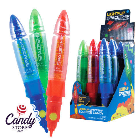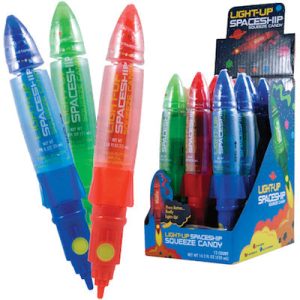 Spaceship squeeze pop is filled with yummy gel candy in watermelon, blue raspberry and strawberry. Push the button on the bottom to light up the rocket.
