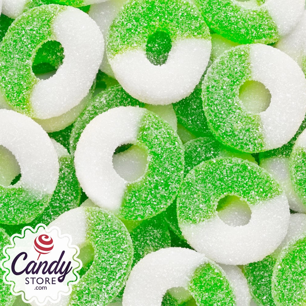 Bright green coloration, boldly contrasting with a creamy white alternate side, might account for the popularity of the Apple Gummy Rings candy, but we think the flavor probably has more to do with it!