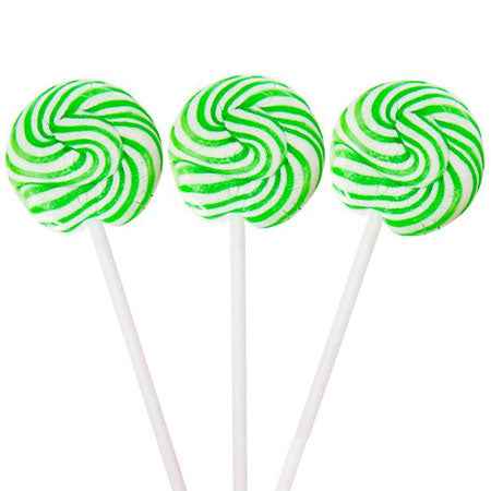Brilliant green and pure white stripes swirl through the surface of these Squiggly Pops lollipops, classic lime-flavored confections on a stick that provide a carnival feel! A top choice for candy buffets at summer weddings, Squiggly Pops are relatively small as novelty suckers go, but definitely large enough to display the visual punch of the fairground-style treat.