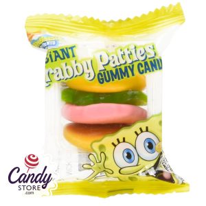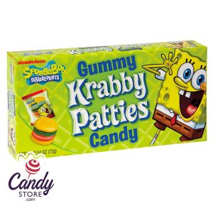 Spongebob Squarepants favorite gummy burger from the Krusty Krab! Individually wrapped gummy burger-like Krabby Patties in theater boxes. A red patty, green picle and two sesame seeds buns. Yum!