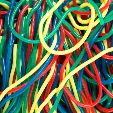 What’s better than sweet licorice you can eat? How about licorice that you can create with! CrEATable candy strings offer the taste and texture you love in a fun treat. Each piece is long and comes in an assortment of bold colors. Try yellow, red, blue, or green or have fun braiding, tying and building with your candy. This assortment includes rainbow licorice laces in green apple, strawberry, lemon, and blue raspberry.