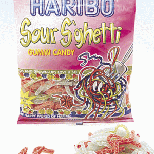 Haribo Sour S’ghetti is unlike any pasta you have ever eaten! Don’t worry, you won’t need to twirl these noodles on a fork. They are enjoyed cool and can be picked up by hand. Each bag features a generous collection of wiggly, wobbly slender lengths that are similar to classic spaghetti.