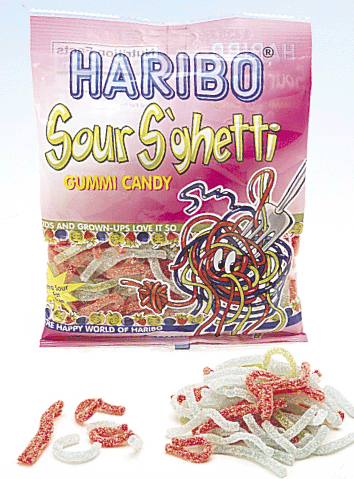 Haribo Sour S’ghetti is unlike any pasta you have ever eaten! Don’t worry, you won’t need to twirl these noodles on a fork. They are enjoyed cool and can be picked up by hand. Each bag features a generous collection of wiggly, wobbly slender lengths that are similar to classic spaghetti.