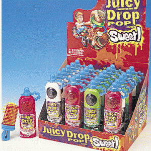 Juicy Drop Pops are a unique novelty candy that’s one part liquid and one part lollipop! Give your taste buds all the sweetness they can handle with this unique confection. Each container includes a broad, flat lollipop made of brightly colored hard candy with a plastic handle on the bottom.
