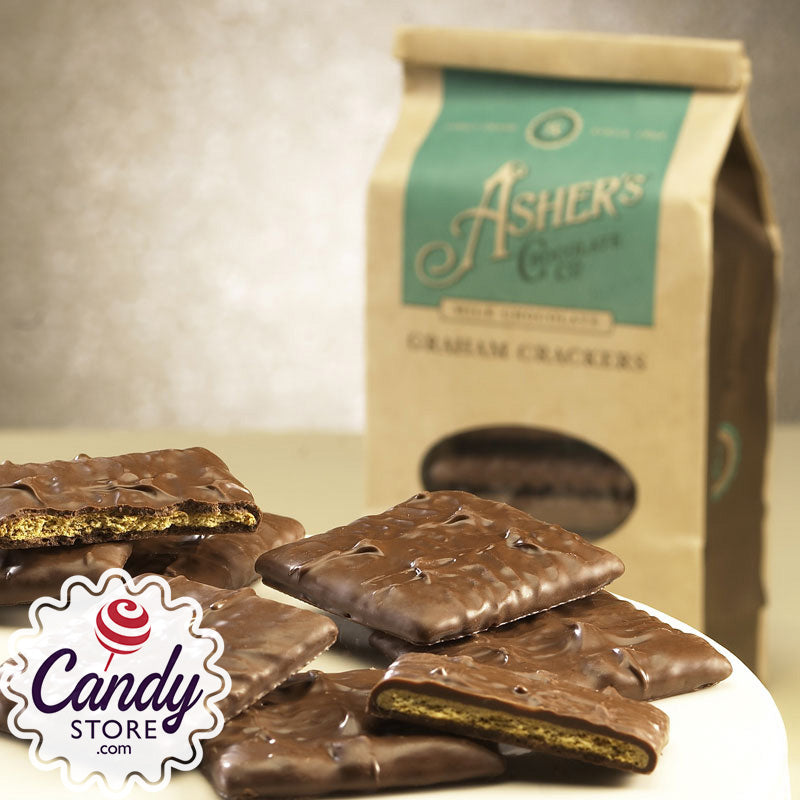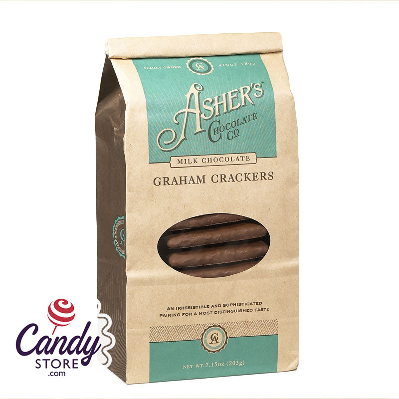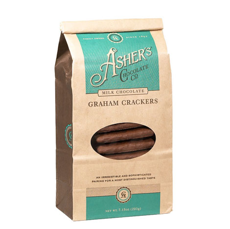 Milk chocolate covered graham crackers from Asher’s mixes together the fine chocolate recipes of Asher’s with the crunchy wholesomeness of good old graham crackers. Just add marshmallow for smores! Bonus they come in attractive gift bags styles after bags of coffee grounds.