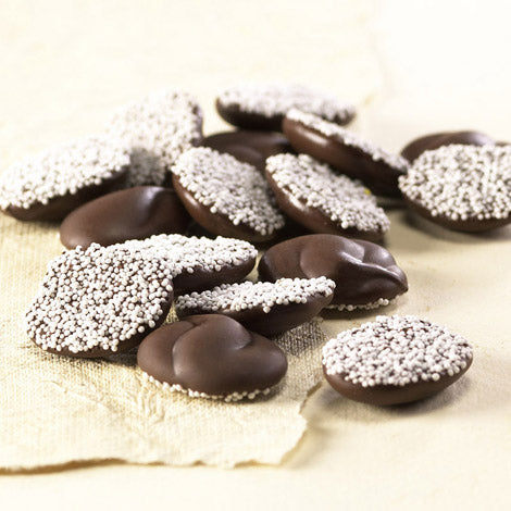 Deep dark chocolate nonpareils have white candies on one side and look gorgeous. Asher’s makes high quality chocolates and these dark chocolate nonpareils are no exception.