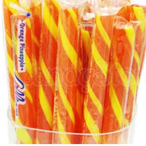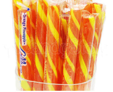 Two tropical flavors come together in our orange pineapple hard candy sticks! Old fashioned candy can be just as exciting as new confections, and our classic candy sticks will prove it! You’ll love every inch of this convenient candy.The surface is smooth and includes a bold orange background with a narrow yellow stripe that wraps around the outside. It’s a rich, warm color combination that hints at the exotic flavors featured in this one-of-a-kind hard candy! Each old fashioned candy stick is individually wrapped in clear plastic so you can admire the stripe before you enjoy. Simply tear open the end and start licking!Our candy sticks are perfect for quick snacking. Just tuck them away in your desk drawer, purse, glove box or anywhere you might get hungry. They can also be used to dress up tables at parties and events for that nostalgic candy shop look. Whether you use them to fill Easter baskets, wedding favors or as a quick after school treat, everyone will love our orange pineapple candy sticks!