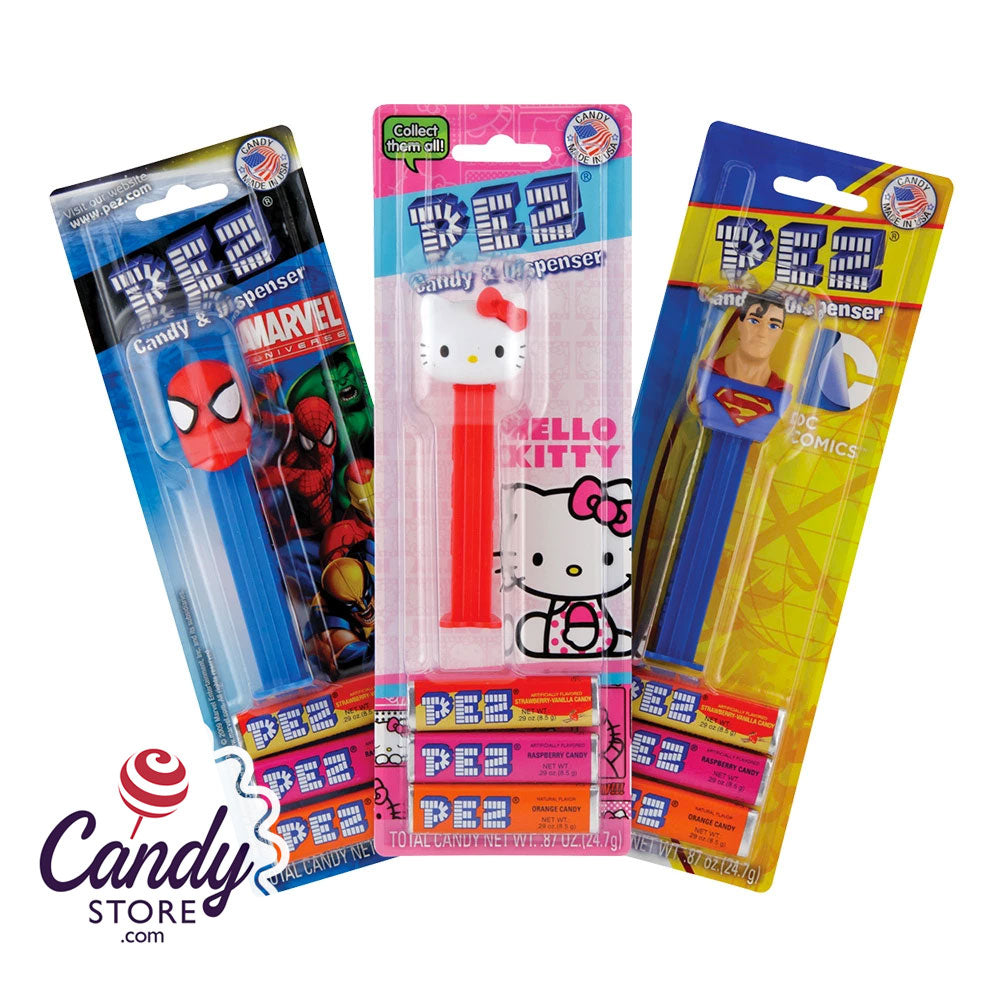 Surprise yourself with our Pez Favorites blister pack! If you hate choosing just one theme, why not try for them all? This original collection brings together many of the most beloved characters featured in the Pez catalog. Each includes an individually packaged plastic dispenser with hinged character head and some pressed candy that fits right inside!