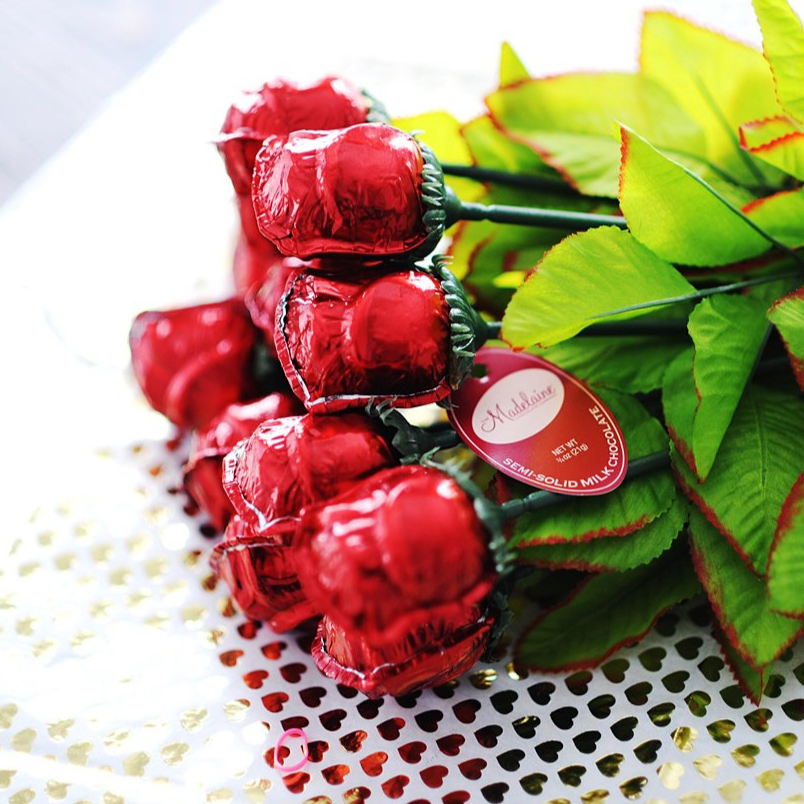 Red chocolate roses bring elegance and sweetness together in one beautiful package. Each semi-solid milk chocolate rose is wrapped in shaded red Italian foil and perched atop a graceful long stem with silk leaves, creating a perfect blend of charm and indulgence.