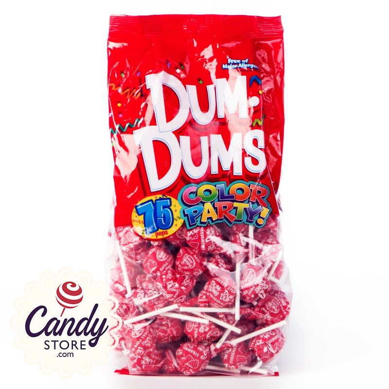 Red Dum Dums lollipops, strawberry flavor. Classic Dum Dums are the sucker that every kid knows, whether you got yours in a hard ware store or 7-11, they are the quintessential American lollipop.