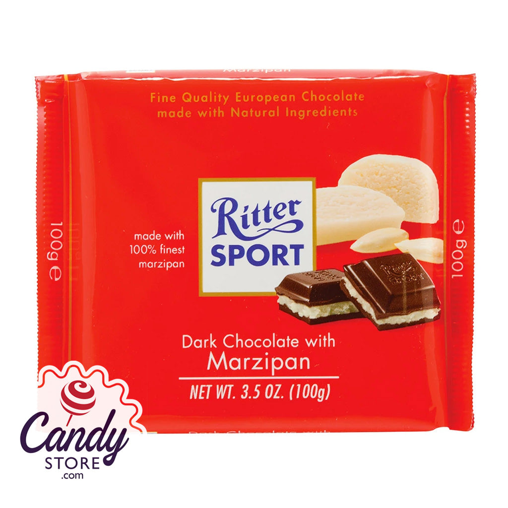 Quality German-made Ritter Sport dark chocolate bars with marzipan. Iconic square-shaped chocolate bars with often unique fillings inside are known throughout the world as one of the finest chocolate bars.