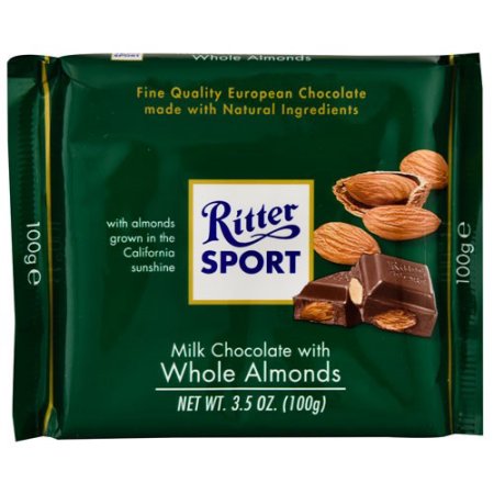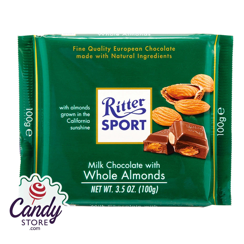 Quality German-made Ritter Sport milk chocolate bars with almonds from Ritter Sport. Iconic square-shaped chocolate bars with often unique fillings inside are known throughout the world as one of the finest chocolate bars.