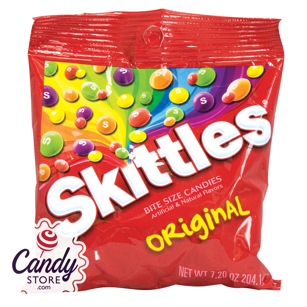 Skittles fruit candy is a popular confection by the Wrigley Company. Each round piece features a colorful candy shell that surrounds a chewy center. The original Skittles assortment consists of a variety of flavors, including lime, lemon, grape, orange and strawberry.