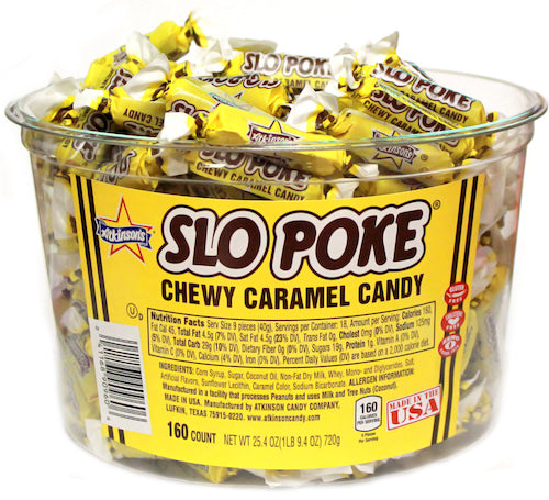 Slo Pokes were introduced back in the 1920s, and still offer the same amazing taste candy lovers crave. This version takes the traditional lollipop and turns it into a convenient bite-sized morsel. Each bite is packed with stiff, chewy caramel confection. They arrive individually wrapped in the nostalgic yellow packaging you know and love. Our bite size Slo Poke candy tub is perfect for snacking or sharing at home, school, or the office!