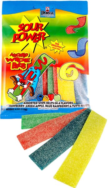 Short but wide Sour Power Belts in 4 different flavors. Solid color sour candy belts in strawberry, green apple, blue raspberry and tutti frutti.