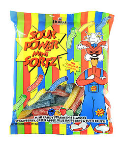 Draw the short straw with these mini Sour Power candies! Small sour candy straws in 4 yummy fruit flavors: strawberry, blue raspberry, green apple and tutti frutti.