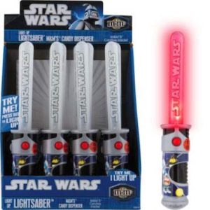 This candy Star Wars Light Saber really does light up. You simply need to push a button. Of course this would not be a cool candy treat without a little candy! Inside this candy Star Wars Light Saber are yummy little dextrose candies.