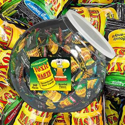 Hazardously sour candy in a bulk fish bowl containter! Assorted flavors of Toxic Waste sour candy in a large bulk changemaker fish bowl.