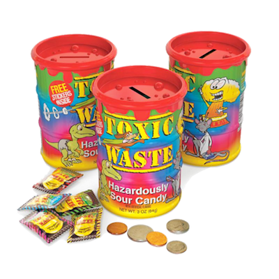 Hazardously sour candy in tie-die colored toxic waste drums that can be used as a piggy bank! Fun novelty toxic waste drum has trippy colorful design and comes with collectible stickers as well as a slot in the top for coins. No one will think to look for your secret money stash in a drum of toxic waste.