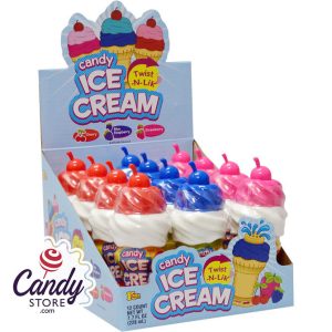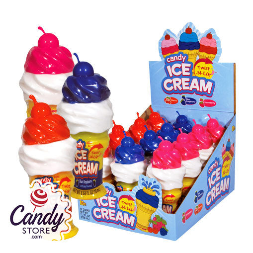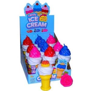 Ice cream cone shaped candy dispenser with yommy soft candy flavored cherry, blue raspberry or strawberry. Just twist off the top and lick for a yummy ice cream candy treat.