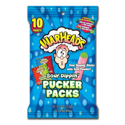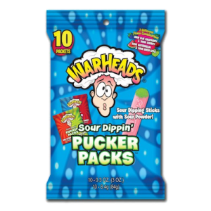 Warheads sour pucker packs are fun and prettttty sour! Dip the sticks into sour candy powder. Grab couple packs to share with friends. Get ready to pucker up buttercup.
