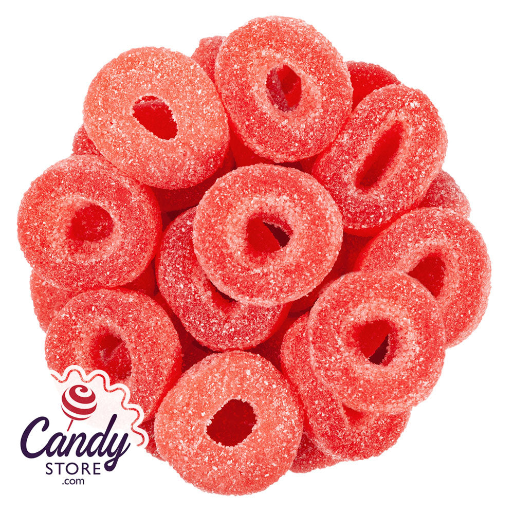 Gummy rings are the fun treat that kids love to eat! The hoop shape can be worn like a ring, stretched or placed on a string to make edible bracelets and necklaces. Kids will love playing with their candy before they eat it (and parents really won’t mind once they try these fruity morsels)! Our watermelon gummy rings feature a half white and half red pattern with an open center and rounded edges. Every piece is smothered in a delicious sugar coating which adds more flavor and texture to each bite.